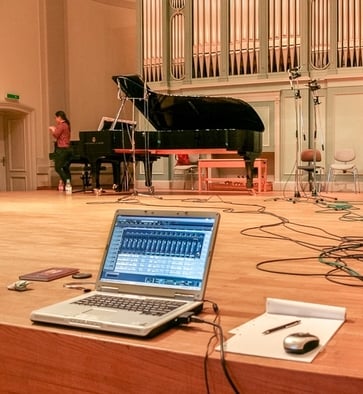 Rechtzeitig vor Beginn des Anlasses wird die technische Ausrüstung aufgebaut und die Platzierung der Mikrofone getestet und optimiert. Ganz entscheidend dabei ist, dass sich alle beteiligten Musiker wohl fühlen und die Technik sie nicht stört. Der Ablauf der Aufnahme selbst hängt von der Darbietung ab. Bei Live-Konzerten wird nach Möglichkeit auch die (Haupt-)Probe oder ein weiteres Konzert im gleichen Saal aufgenommen, um genügend Schnittmaterial für Korrekturen zu haben. Bei Aufnahmen ohne Publikum werden 3 bis 4 Takes pro Musikstück aufgenommen, um ebenfalls genügend Schnittmaterial zur Verfügung zu haben. Die Aufnahmen vor Ort werden direkt auf Festplatte gespeichert, was die späteren Arbeitsschritte erleichtert.